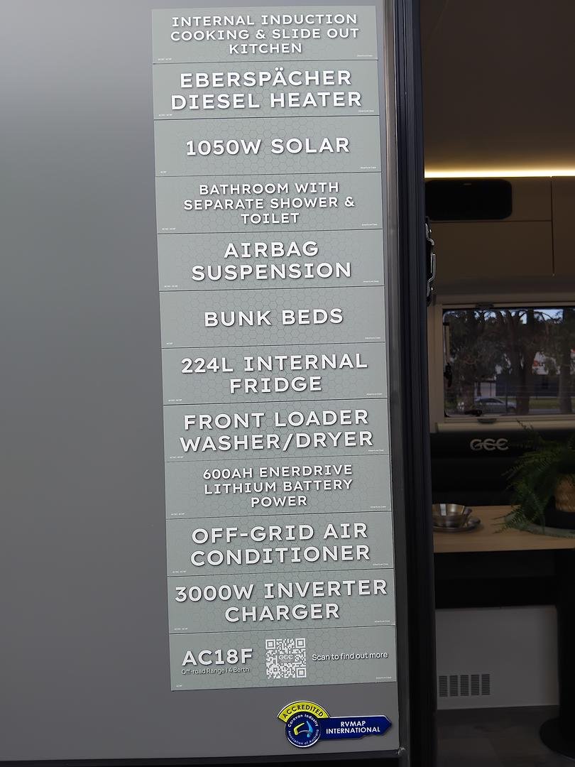 Experience versatile mobile luxury with the Adventure Class 18ft Family model (AC18F) from Gold Class Caravans. Perfectly tailored for families who seek both adventure and comfort, this off-road marvel features a robust tandem axle configuration, refined Airbag Man suspension, a reliable 600Ah Enerdrive Lithium Battery, and 1050W of high-efficiency rooftop solar to power extended off-grid excursions. Every detail from the premium Eberspächer Diesel Heater to the expertly designed slide-out kitchen with a Thetford triple gas burner cooktop and NCE front loader washer/dryer is meticulously engineered for optimal performance and family-friendly functionality. Step inside to discover a spacious interior that blends modern design with innovative storage, ensuring every family journey is as comfortable as it is exciting.