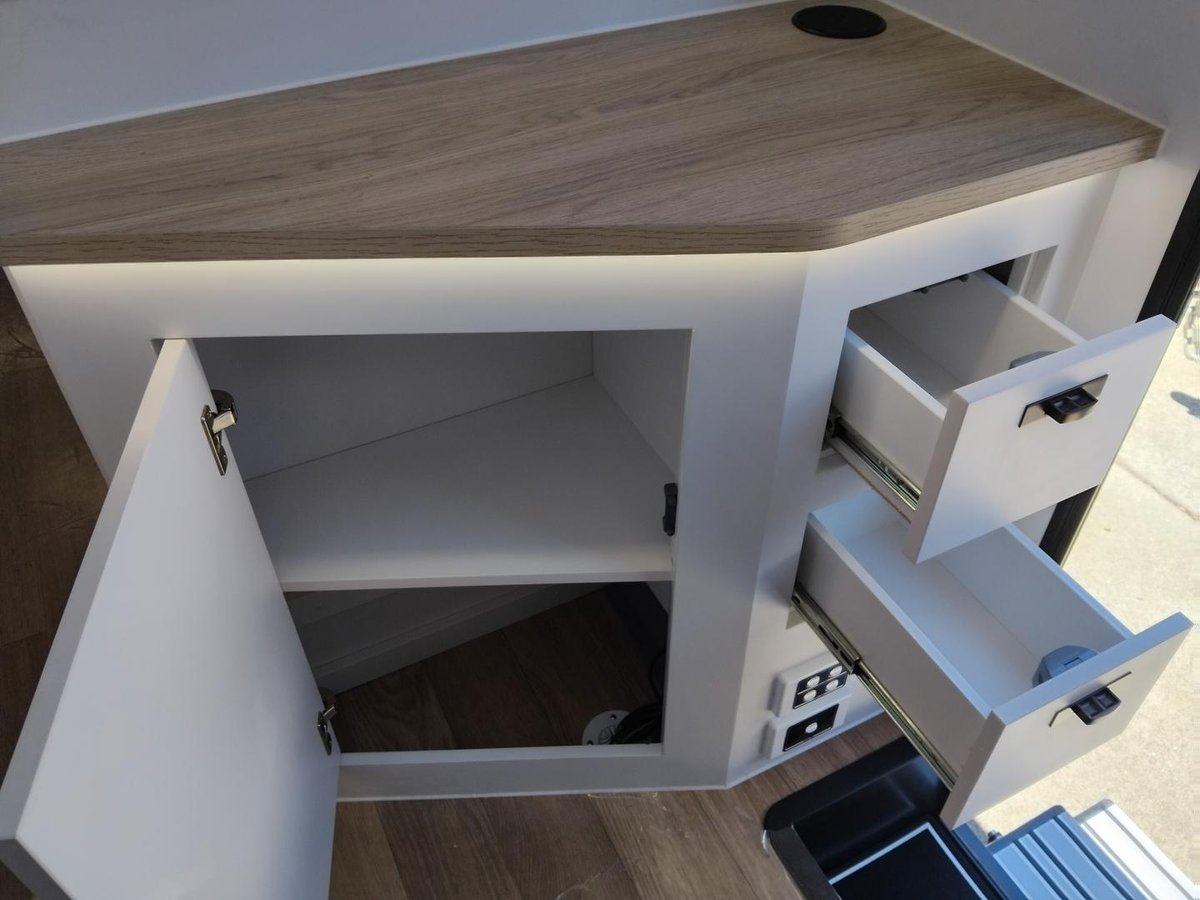 Discover elevated touring luxury with the Luxe Class 17ft Couples model (LC17C) from Gold Class Caravans, now redefined as part of our Semi-Offroad range. Perfect for couples who desire a tandem-axle caravan that merges comfort and versatility for sealed road journeys; with the capacity to handle occasional light off-road conditions, this model boasts independent coil suspension, a 300Ah Enerdrive Lithium Battery system, 525W of rooftop solar, and a 2000W Enerdrive Pure Sinewave Inverter for sustained off-grid living. Every component, from the Eberspächer Diesel Heater to the efficient NCE washer/dryer and Dometic induction cooking setup, is expertly designed to enhance your travel experience. Step inside to find a refined interior accented by leatherette upholstery, soft-close cabinetry, and dusk bronze fixtures, creating a warm retreat wherever the road leads.