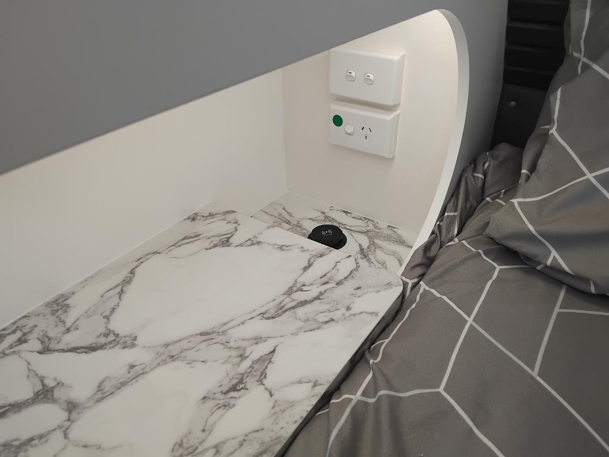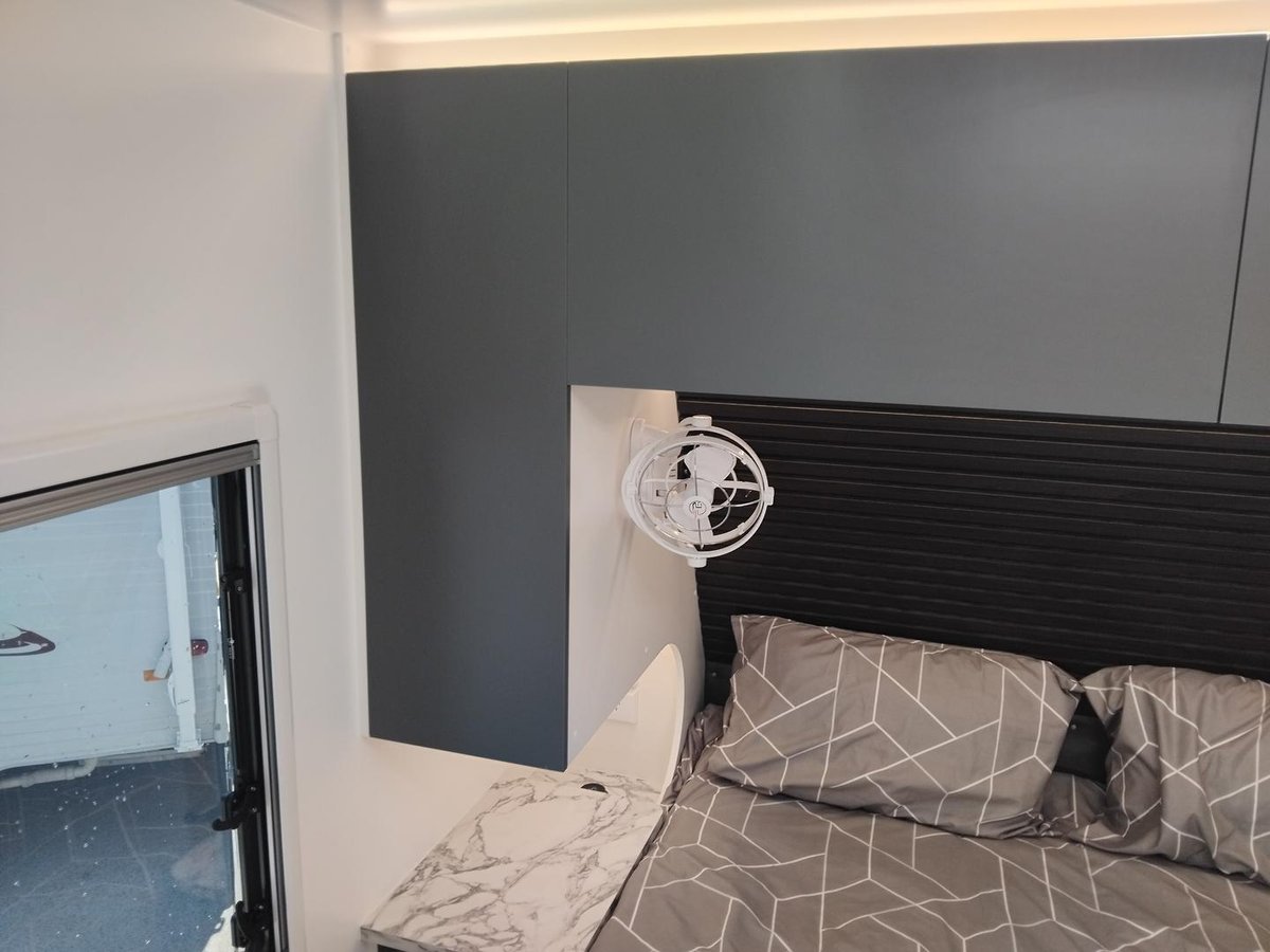 * Fan above bed.